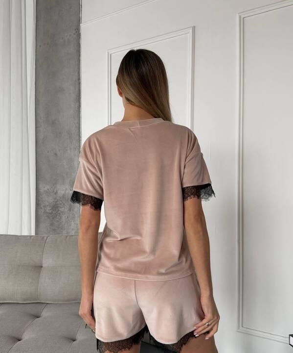 Пижама женская велюровая домашняя шорты и футболка с коротким рукавом и кружевной отделкой демисезонная k-128025
