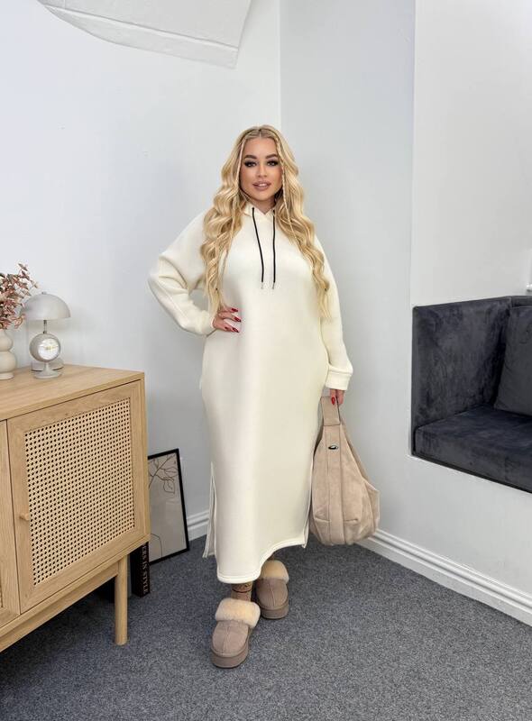 Платье выполнено в удлинённом крое и имеет аккуратные боковые разрезы, которые обеспечивают свободу движений. Объёмный капюшон с завязками придаёт изделию спортивный характер, а качественный накат добавляет оригинальности и стильного акцента. Модель подходит для повседневных образов, прогулок и уютных вечеров — это универсальная вещь, сочетающая функциональность и эстетику.