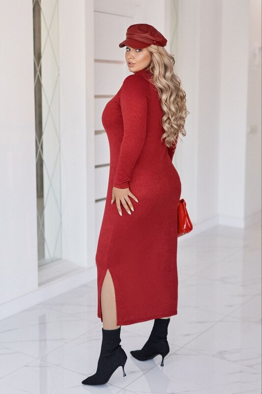 Платье имеет длину миди и прямой фасон, который визуально вытягивает фигуру, создавая утончённый силуэт. Горловина оформлена аккуратным воротником-хомутом, добавляющим мягкости и изящества. Длинные рукава обеспечивают дополнительный комфорт и делают модель практичной для прохладных дней. По бокам предусмотрены разрезы, которые придают легкость и динамичность шагу, а также визуально стройнят образ.