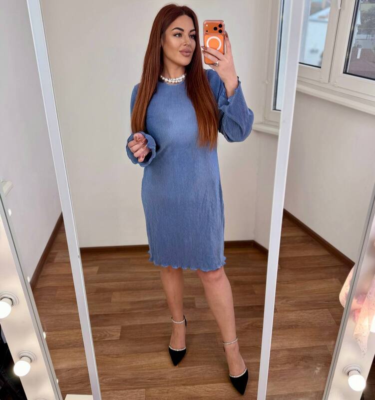 Женское платье-плиссе из мягкой эластичной ткани — это воплощение нежности, стиля и комфорта. Материал с гофрированной текстурой красиво драпируется, мягко повторяя линии фигуры, и при этом не сковывает движений. Плиссированная ткань прекрасно тянется, не мнётся и сохраняет форму, делая изделие практичным и долговечным. Свободный прямой фасон подходит для женщин с любым типом фигуры, подчёркивая женственность и скрывая возможные несовершенства. Длина чуть выше колена придаёт образу лёгкость, а длинные рукава делают платье особенно уместным в прохладное время года. Края рукавов и подол имеют лёгкий волнистый эффект, добавляющий изысканности и воздушности.