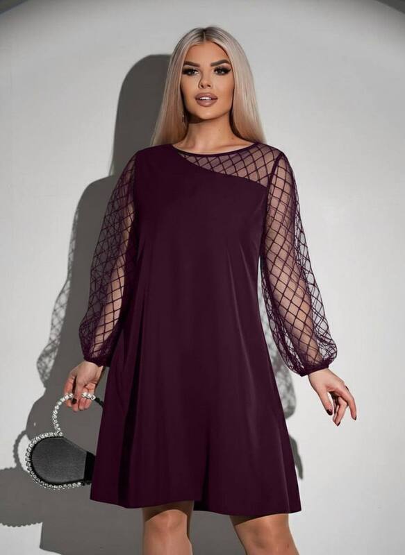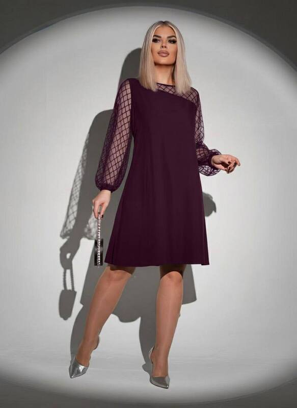 Главный акцент модели — прозрачные сетчатые рукава с узором в клетку и вставка в зоне декольте. Эта деталь придаёт платью утончённый шарм, добавляет лёгкости и визуального объёма, создавая эффект воздушности при каждом движении. Рукава выполнены в мягком объёмном фасоне, присборены у манжет, что подчёркивает женственность и делает образ более выразительным. Деликатная сетка идеально гармонирует с плотным креп-дайвингом, создавая баланс фактур.