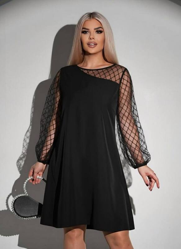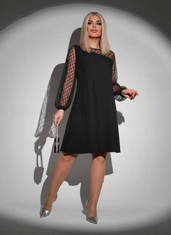 • Акцентом модели выступают прозрачные сетчатые рукава и вставка в зоне декольте. Геометрический рисунок в клетку делает образ более выразительным, добавляет глубину и визуальный интерес, сохраняя при этом благородную сдержанность. Лёгкая прозрачность создаёт эффект воздушности, а аккуратное оформление манжет подчёркивает аккуратность и изысканность изделия. Такая деталь выгодно выделяет платье среди базовых вариантов и делает его подходящим как для торжественных событий, так и для стильных будней.
