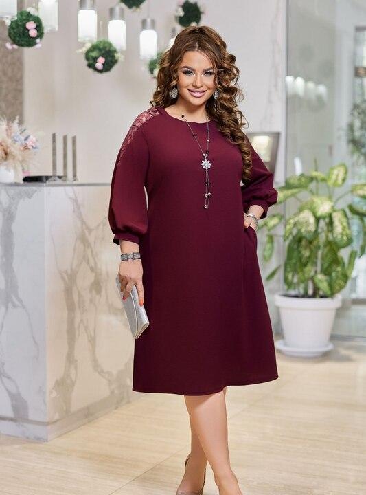 Платье-трапеция женское из крепа дайвинга миди с кружевной вышивкой на сетке свободного кроя весеннее k-128297