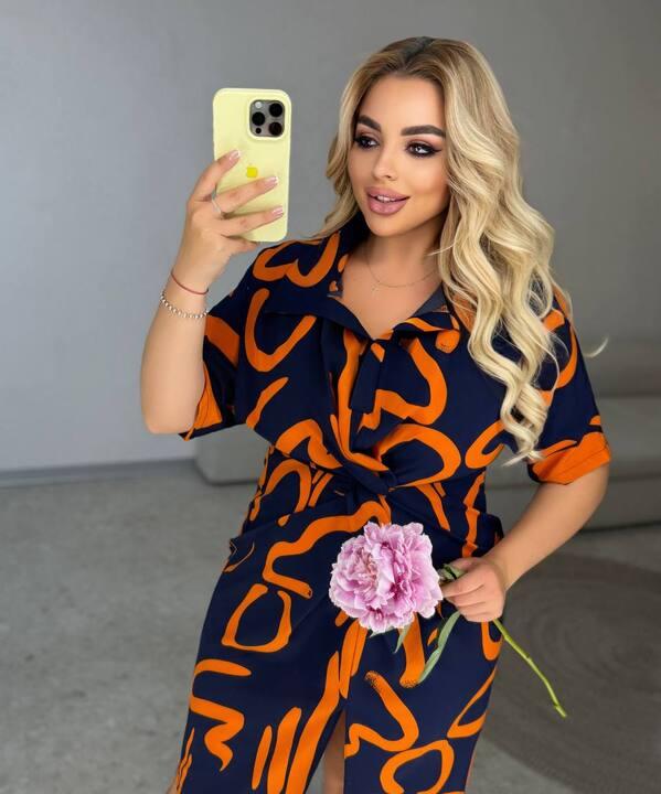 Платье-рубашка женское из софта с абстрактным принтом и драпировкой на талии миди весеннее k-128394