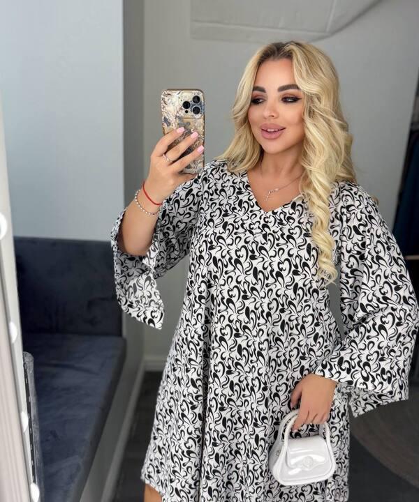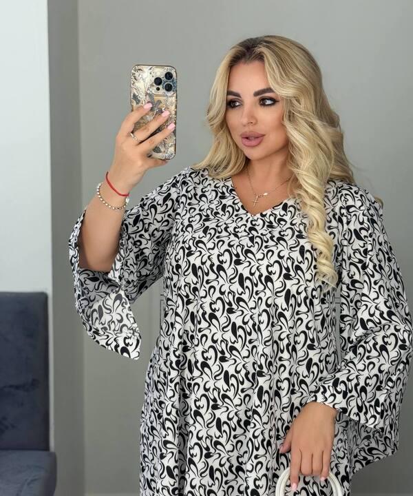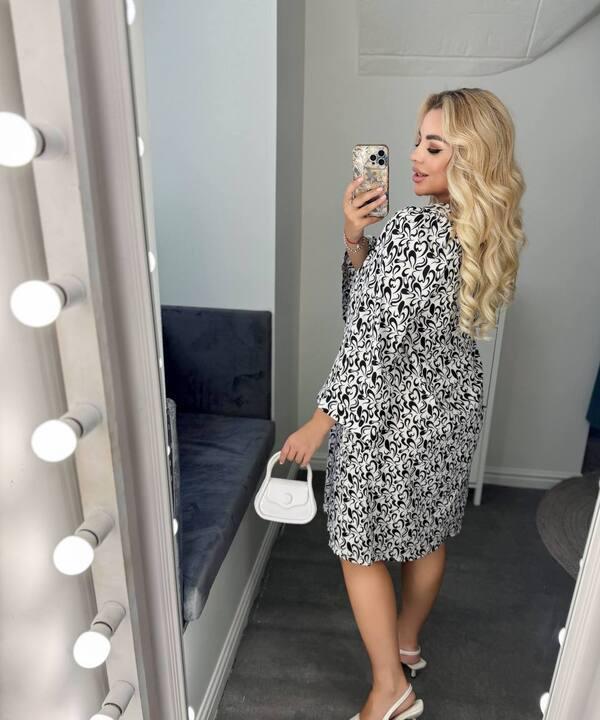 Отдельного внимания заслуживает принт. Абстрактный рисунок делает платье современным, стильным и запоминающимся, поэтому даже без большого количества аксессуаров образ выглядит завершенным. Рукава удобной длины делают модель практичной для теплого сезона, а универсальная длина позволяет носить платье как в повседневных, так и в более нарядных городских сочетаниях. Такое платье красиво смотрится с босоножками, туфлями, небольшой сумкой и лаконичными украшениями, легко подстраиваясь под разное настроение образа.