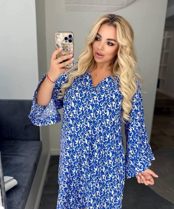 Отдельного внимания заслуживают рукава. Они расклешенные, выразительные и очень красиво дополняют общий фасон платья, придавая ему легкость и более нарядное настроение. Принт делает модель заметной, современной и интересной, благодаря чему платье выглядит самодостаточно и стильно даже без большого количества аксессуаров. Такая вещь прекрасно сочетается с туфлями, босоножками, небольшими сумками и лаконичными украшениями, позволяя создавать как повседневные, так и более собранные женственные образы.