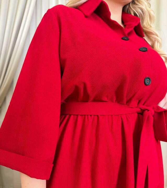 Фасон выполнен в рубашечном стиле, поэтому модель сочетает в себе удобство классического кроя и женственную подачу. Верх оформлен аккуратным отложным воротником и застежкой на пуговицах, что делает платье визуально более изящным и добавляет ему характер. Линия талии подчеркнута поясом, за счет чего силуэт выглядит гармонично, женственно и особенно привлекательно. Юбка мягко расширяется книзу, красиво движется при ходьбе и добавляет образу легкость.