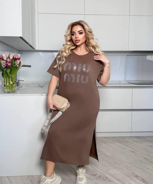 Передняя часть изделия дополнена выразительной надписью, которая делает модель более современной и заметной. Благодаря этой детали платье выглядит интересно даже без сложного декора и отлично подходит для стильных повседневных образов. Его легко сочетать с кроссовками, кедами, сандалиями, сумками через плечо и лаконичными аксессуарами.