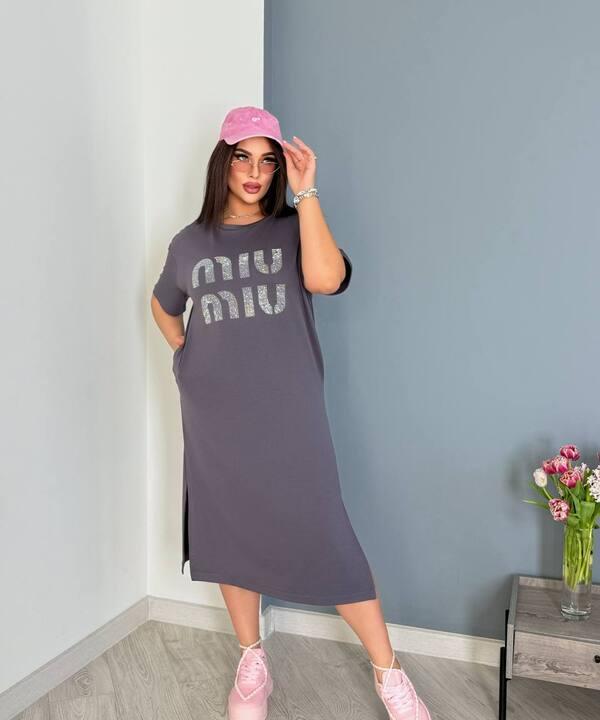 Платье-футболка женское из двунитки прямого кроя с надписью и боковыми разрезами весеннее k-128735