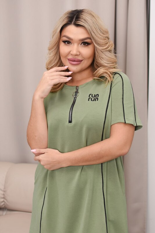 Фасон продуман так, чтобы платье красиво смотрелось на фигуре и при этом оставалось максимально удобным. Свободный силуэт помогает скрыть нюансы, визуально делает образ более легким и современным, а короткий рукав добавляет практичности. Аккуратная молния на груди не только украшает модель, но и делает ее более выразительной. Контрастное кантовое оформление визуально вытягивает силуэт и придает платью характер, а удобные карманы добавляют еще больше функциональности и делают эту модель особенно комфортной для повседневной носки.