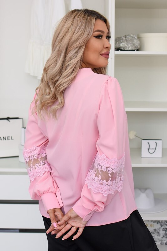 Главный акцент этой блузы — декоративные кружевные вставки на рукавах. Именно они делают модель более нежной, женственной и визуально дорогой. Такая деталь добавляет образу утонченность, легкость и особое настроение, благодаря чему блуза смотрится не просто базовой, а действительно интересной и запоминающейся. Круглый вырез подчеркивает мягкость образа и делает верхнюю часть силуэта особенно аккуратной.
