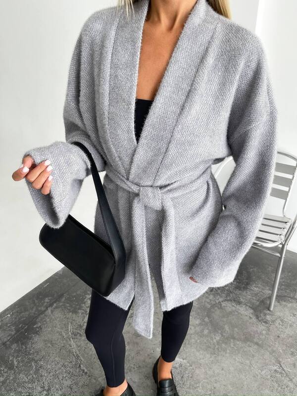 Свободный фасон с широкими рукавами создает эффектный силуэт и подчеркивает непринужденность стиля. Пояс в тон позволяет регулировать посадку по талии: его можно завязать для создания женственного образа или носить кардиган распахнутым, добавив в наряд легкости и динамики.