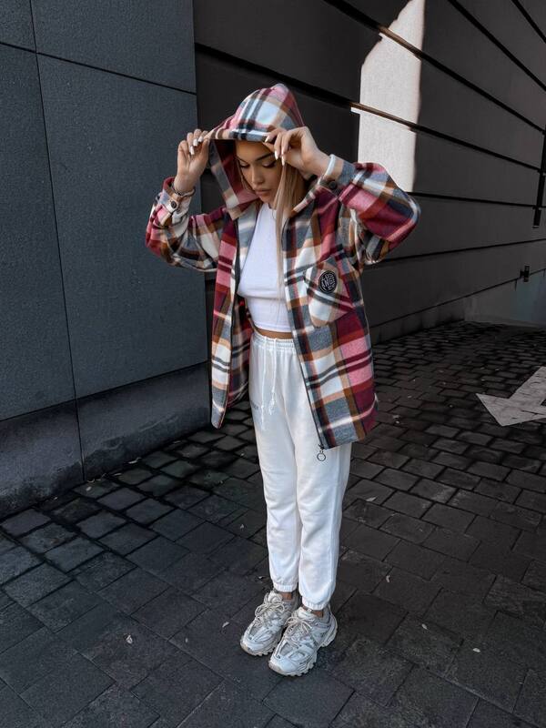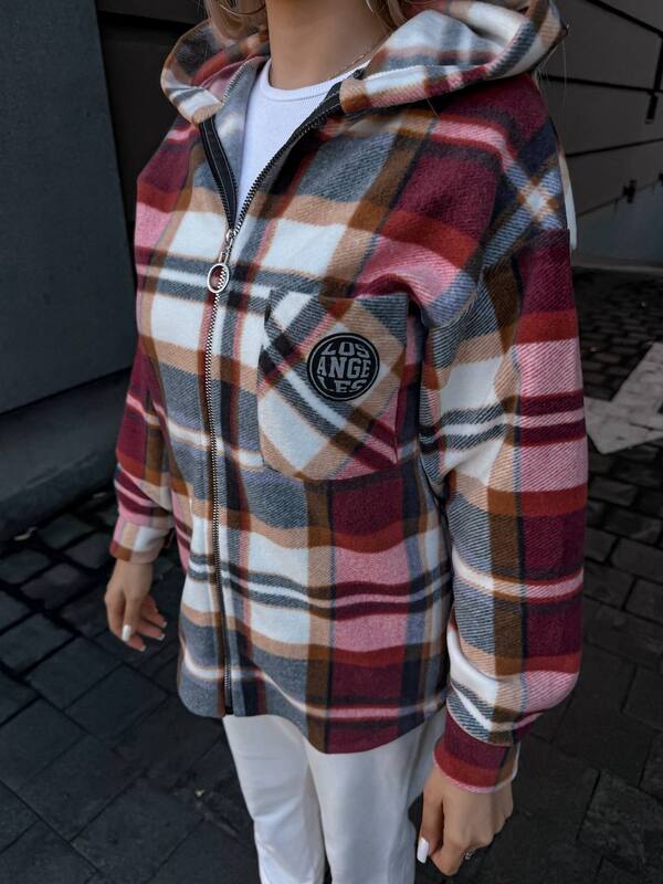 Кофта выполнена в свободном крое, что делает её удобной в носке и универсальной для любых фигур. Модель застёгивается на молнию и дополнена капюшоном, который защищает от ветра и холода. Карманы добавляют функциональности, а контрастный клетчатый узор делает образ современным и выразительным.