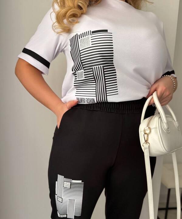 Верх выполнен в формате свободной футболки, которая красиво садится по фигуре, не сковывает движения и дарит ощущение легкости в течение всего дня. Рукав комфортной длины делает модель особенно удобной и добавляет образу современную расслабленность. Декоративные накаты на футболке придают комплекту характер, делают его более выразительным и заметным, а отделка киперной лентой добавляет динамики и завершенности. Такой верх легко носить не только в комплекте, но и отдельно, сочетая с джинсами, шортами, леггинсами или базовыми брюками.