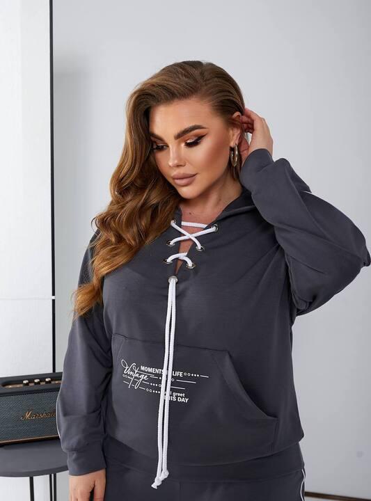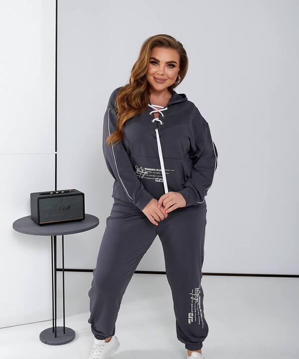 Верх выполнен в формате удобного худи с капюшоном и эффектной шнуровкой в зоне горловины, которая придает образу выразительность и делает модель более интересной визуально. Рукава дополнены контрастной декоративной отделкой, а по низу передней части расположены удобные карманы, которые добавляют практичности и завершают общий образ. Посадка верха комфортная, с хорошим запасом свободы, благодаря чему изделие приятно носить в течение всего дня.