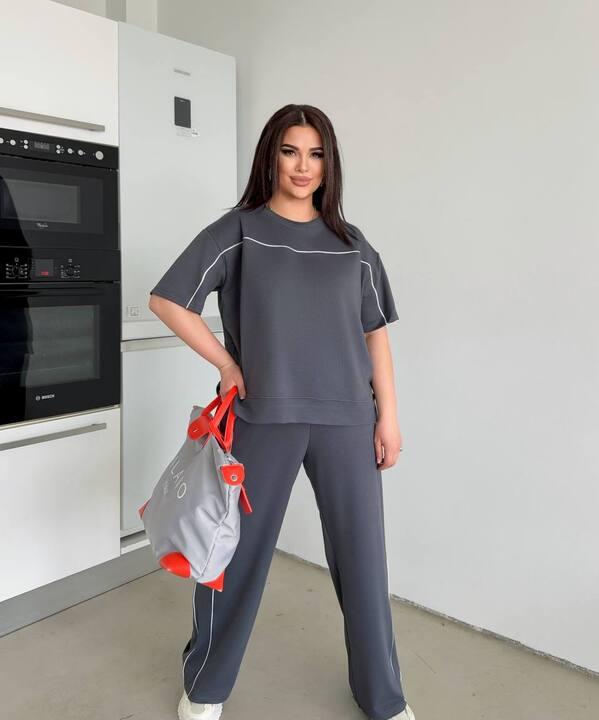 Верх выполнен в формате свободной футболки, которая мягко садится по фигуре и создает расслабленный силуэт. Брюки дополняют комплект, формируя гармоничный и вытянутый образ. Пояс делает посадку более комфортной, а общий крой позволяет чувствовать себя свободно и уверенно. Отдельного внимания заслуживает лаконичная отделка с контрастными линиями, которая придает костюму более выразительный и стильный вид. Благодаря таким деталям комплект выглядит интереснее, но при этом остается универсальным и легко комбинируется с базовой обувью, сумками и верхней одеждой.