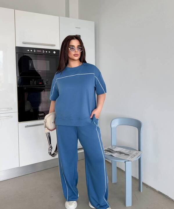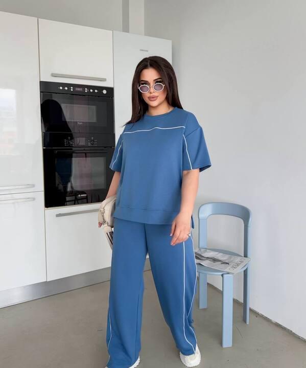 Верх выполнен в формате свободной футболки с расслабленной посадкой, которая мягко ложится по фигуре и создает актуальный современный силуэт. Брюки свободного кроя визуально вытягивают образ и делают его более стройным и гармоничным, при этом не сковывают движения и подходят для повседневной активности. Боковые карманы добавляют практичности, а аккуратная контрастная отделка делает комплект более выразительным, стильным и завершенным. Благодаря этим деталям костюм выглядит не просто базово, а действительно модно и интересно.