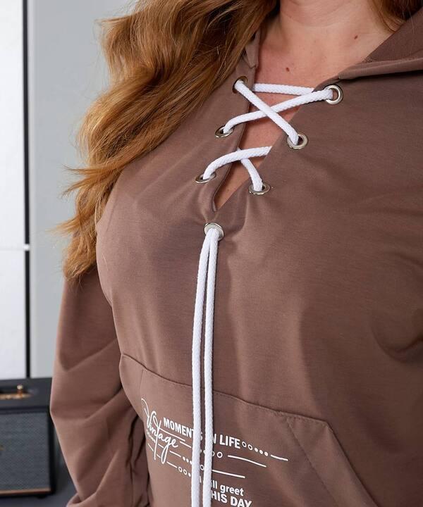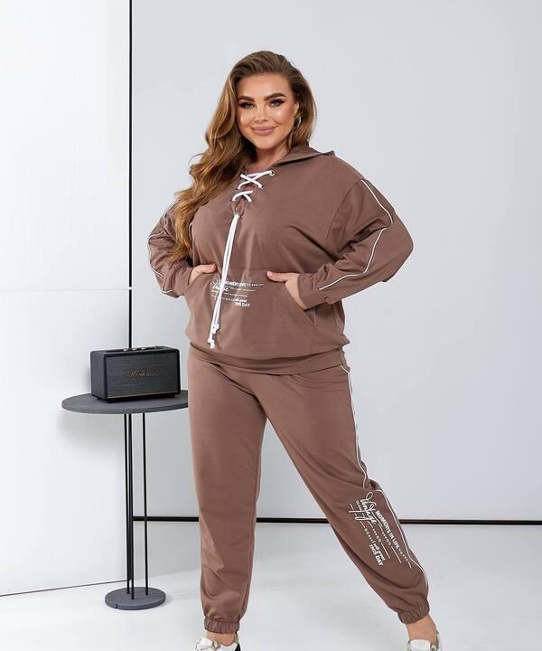 Верх выполнен в формате удобного худи с капюшоном и эффектной шнуровкой в зоне горловины, которая придает образу выразительность и делает модель более интересной визуально. Рукава дополнены контрастной декоративной отделкой, а по низу передней части расположены удобные карманы, которые добавляют практичности и завершают общий образ. Посадка верха комфортная, с хорошим запасом свободы, благодаря чему изделие приятно носить в течение всего дня.