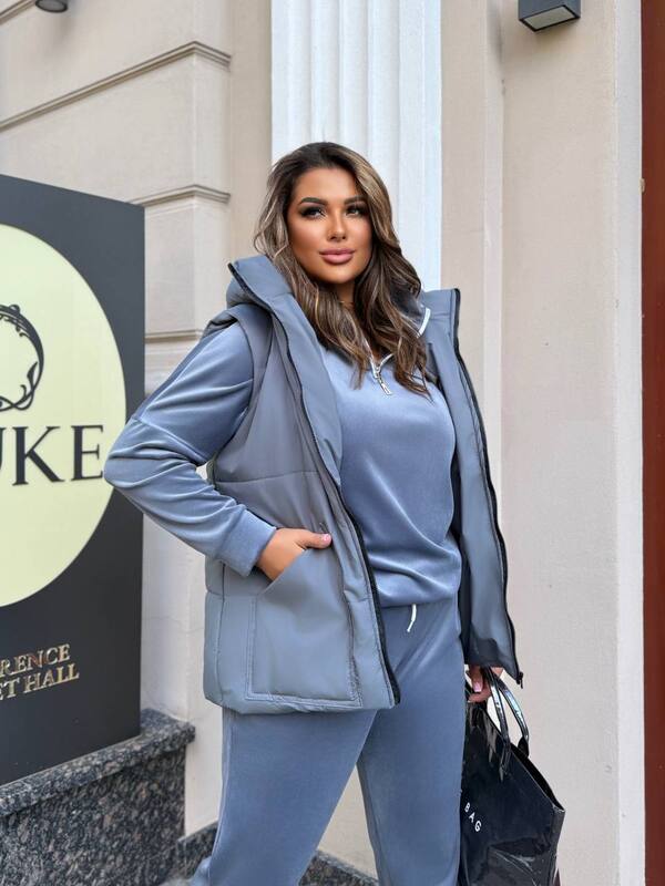 Комплект состоит из трёх элементов: удлинённого жилета, кофты и брюк. Жилет выполнен из водоотталкивающей ткани, дополнен воротником-стойкой и удобными карманами, что делает его практичным и функциональным. Кофта из велюра имеет свободный крой, мягко облегает фигуру и дарит комфорт в течение дня. Брюки длиной по внешнему шву 100–101 см имеют эластичный пояс и прямой силуэт, обеспечивающий свободу движений и удобную посадку. Все элементы можно носить как вместе, так и по отдельности, комбинируя с другими вещами гардероба.
