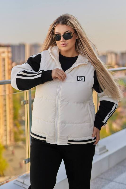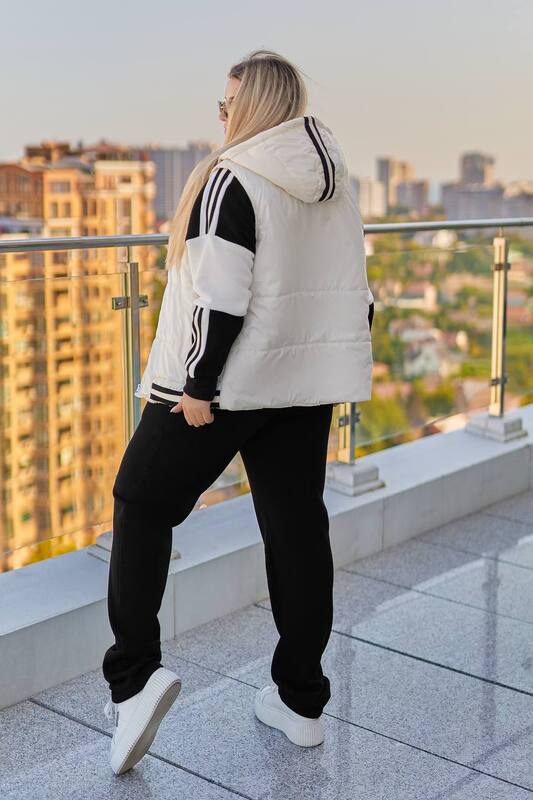 Элегантный женский костюм-тройка станет стильным и практичным решением для прохладного сезона. В комплект входит стеганый жилет на утеплителе из плотной плащевки с удобным капюшоном и боковыми карманами на молнии. Жилет дополнен лампасной отделкой по капюшону и низу, а также нашивкой на груди, что придаёт образу спортивный и современный акцент.