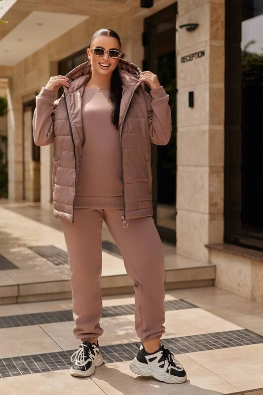 В комплект входит уютный свитшот свободного кроя, брюки-джоггеры с эластичным поясом и манжетами, а также утеплённый жилет с капюшоном на подкладке из силикона плотностью 150 г/м². Такой жилет надёжно защищает от ветра и холода, а лёгкая плащёвка Лаке делает модель практичной и непромокаемой. Все элементы костюма идеально гармонируют между собой, создавая сбалансированный и стильный образ.