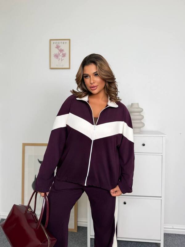 Верх костюма — стильная куртка на молнии с контрастной белой вставкой по линии груди и плеч. Свободный крой, спущенная линия плеч и манжеты на резинке делают силуэт расслабленным и современным. Брюки прямого кроя с лампасами визуально вытягивают силуэт и подчеркивают фигуру, а эластичный пояс гарантирует комфорт в движении.