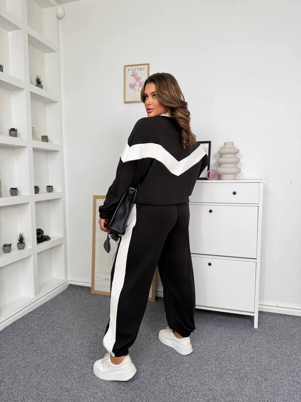 Женский спортивный костюм из мягкого трикотажа пума — это воплощение уюта и динамичного стиля. Материал отличается бархатистой поверхностью с обеих сторон, приятен к телу, не сковывает движений и сохраняет форму после стирки. Куртка на молнии выполнена в модном контрастном дизайне: черный фон гармонично сочетается с белой вставкой по груди и рукавам, визуально подчеркивая линию плеч. Манжеты и низ изделия аккуратно оформлены, обеспечивая комфортную посадку и защиту от холода.