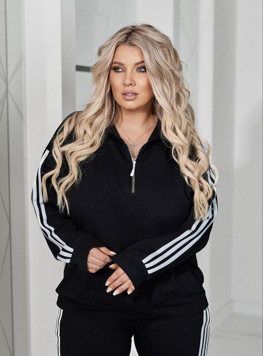 Кофта выполнена в свободном крое, поэтому красиво садится по фигуре, не сковывает движения и дарит комфорт в течение всего дня. Воротник-стойка с молнией делает верх особенно удобным и современным, добавляет образу спортивный характер и позволяет по-разному обыгрывать посадку. Длинные рукава и аккуратные лампасы подчеркивают динамичный стиль модели и делают костюм визуально более выразительным. Верх легко сочетается не только с комплектными брюками, но и с джинсами, леггинсами или другой повседневной одеждой.