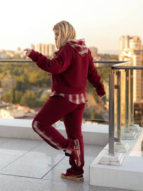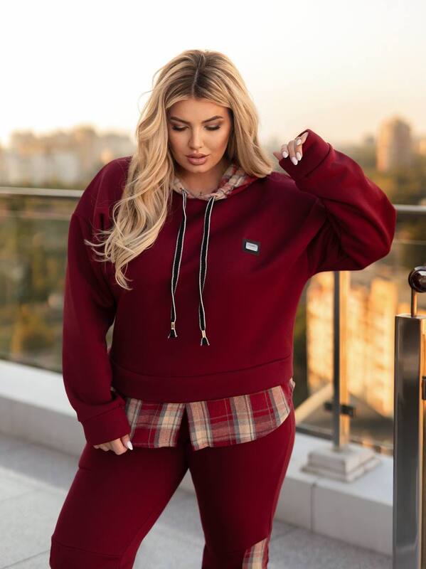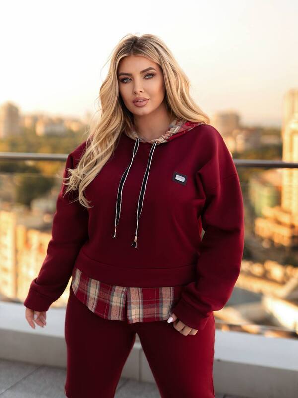 Женский спортивный костюм в стильном бордовом цвете — это сочетание уюта, тепла и модного дизайна для осенне-зимнего сезона. Он выполнен из качественной трехнитки с утеплением и дополнен вставками из сорочковой ткани в клетку, которые придают образу оригинальность и создают эффект многослойности.