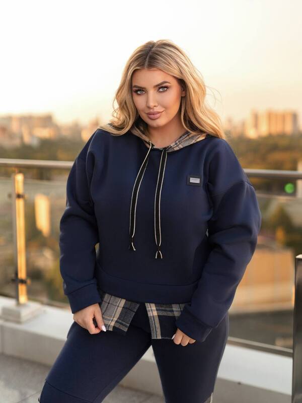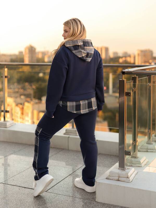 Женский спортивный костюм в насыщенном синем цвете — это универсальное решение для осенне-зимнего сезона, которое сочетает комфорт, стиль и практичность. Модель выполнена из плотной утепленной трехнитки и дополнена вставками из сорочковой ткани в клетку, что делает костюм уникальным и подчеркивает индивидуальность образа.