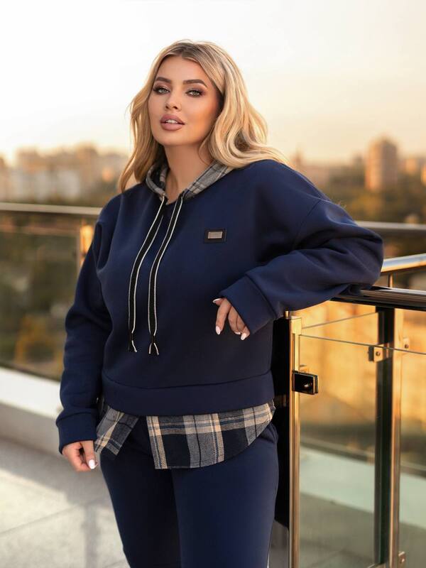 Толстовка свободного кроя с капюшоном и кулиской обеспечивает уют и защиту в прохладную погоду. Вставка внизу и на манжетах в стиле рубашки создает эффект многослойности, добавляя интересный акцент. Брюки прямого кроя с удобной посадкой на резинке и клетчатыми вставками по бокам смотрятся современно и обеспечивают свободу движений.