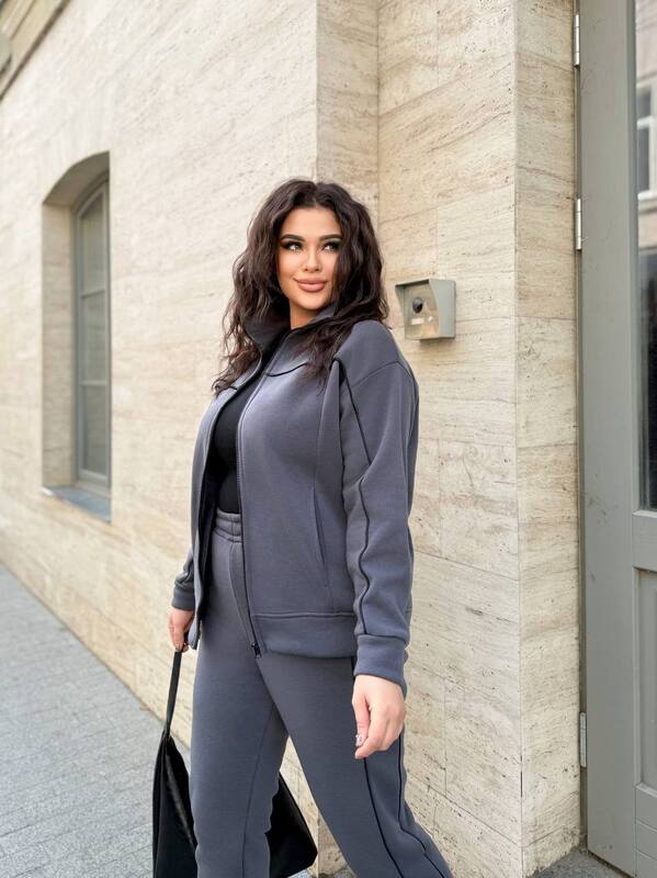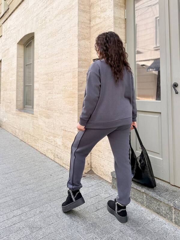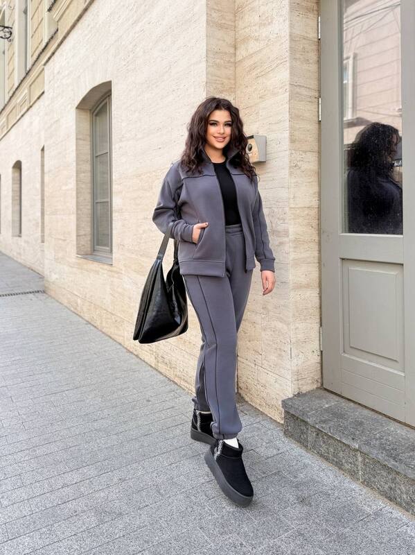 Графитовый цвет делает модель универсальной и легко сочетаемой с различной обувью и аксессуарами. Такой костюм станет базой для создания уютных городских образов: его можно носить с кроссовками для прогулок или утепленными ботинками для более холодной погоды.