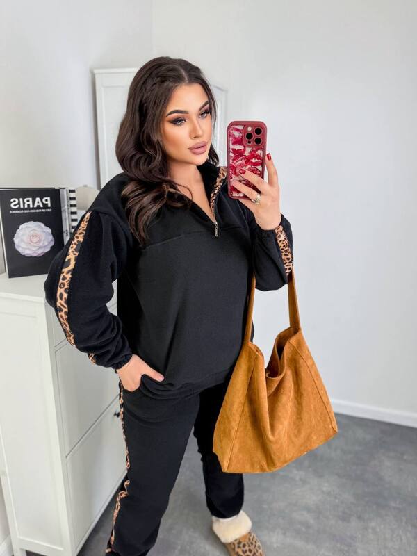 Толстовка свободного кроя с удобной молнией до середины груди создаёт практичный и современный образ. Воротник-стойка защищает от холода и подчёркивает линию шеи. По бокам расположены удобные карманы, а мягкие манжеты на рукавах удерживают тепло. Брюки с эластичным поясом и манжетами снизу идеально садятся по фигуре, обеспечивая комфорт при носке. Леопардовые лампасы по рукавам и штанам добавляют модный акцент и визуально вытягивают силуэт, делая образ стильным и выразительным.