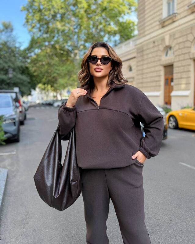 Кофта имеет комфортный свободный силуэт, воротник-стойку и регулирующий шнурок по низу, что позволяет подстраивать посадку под фигуру. Брюки с эластичным поясом и манжетами обеспечивают идеальную посадку и свободу движений. Костюм не сковывает тело, прекрасно тянется и дарит ощущение максимального комфорта при носке. Он подойдёт для прогулок, отдыха, поездок или повседневного использования в прохладное время года.