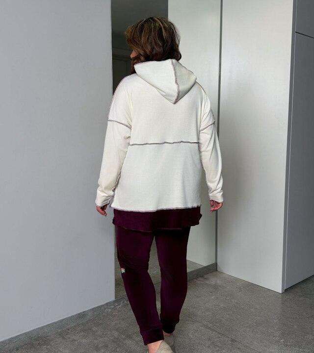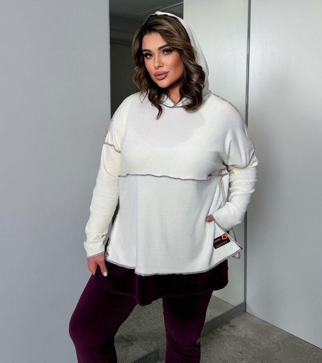 Туника свободного кроя особенно удобна в носке. Она не сковывает движения, мягко сидит по фигуре и позволяет чувствовать себя уверенно в течение всего дня. Интересный крой делает верх более современным и заметным, а удлиненная линия добавляет комфорта и помогает создать красивый силуэт. Такой фасон особенно удачен для размеров plus size, потому что он не перегружает фигуру и смотрится гармонично. По фото видно, что костюм выглядит очень носибельно и универсально, поэтому его легко адаптировать под повседневный гардероб и сочетать с удобной обувью в спортивном или городском стиле.