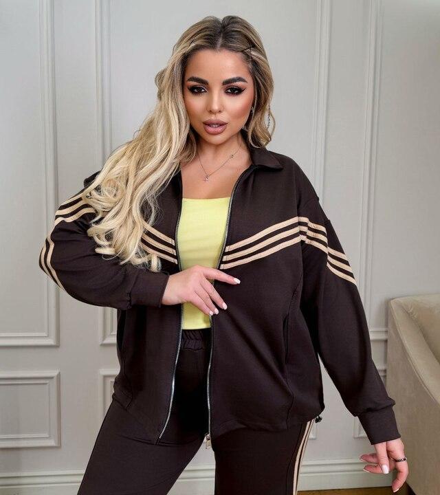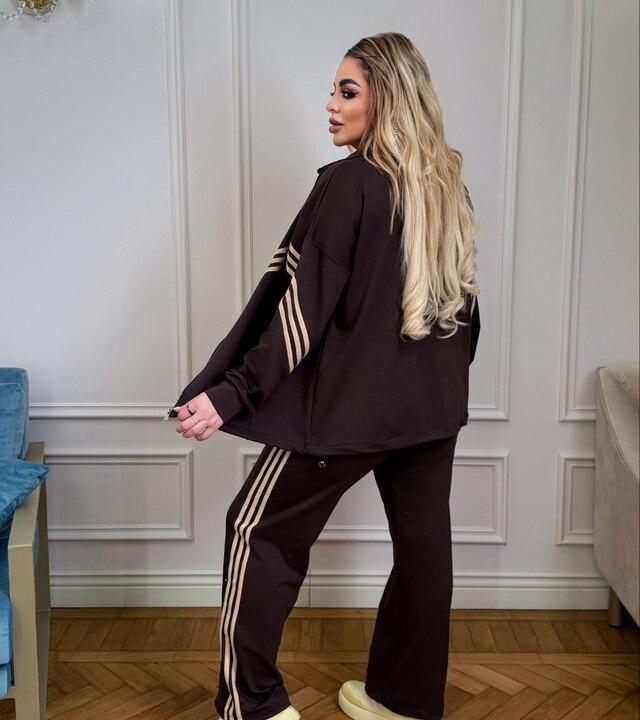 Женский спортивный костюм-двойка — это удобный, современный и очень практичный комплект, который отлично подходит для повседневной носки, прогулок, поездок и активного ритма жизни. По фото видно, что костюм смотрится стильно, собранно и актуально, а свободная посадка делает образ комфортным и уверенным. Такой комплект легко становится одной из самых любимых вещей в гардеробе, потому что сочетает в себе удобство, красивую посадку и универсальность, которая особенно ценится в одежде на каждый день.