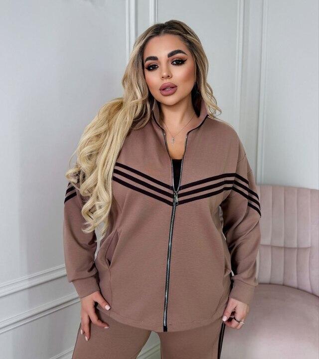 Брюки с высокой посадкой делают комплект особенно комфортным и удачным для размеров plus size. Такой фасон помогает красиво оформить силуэт, делает посадку более удобной и позволяет чувствовать себя уверенно в течение всего дня. Низ брюк с регулировкой добавляет практичности и позволяет подстроить модель под обувь и личные предпочтения. Этот костюм можно носить как готовый образ или сочетать верх и низ отдельно с другими вещами гардероба. Это отличный выбор для женщин, которые ищут современный, удобный и действительно носибельный спортивный костюм с красивой посадкой и продуманными деталями.