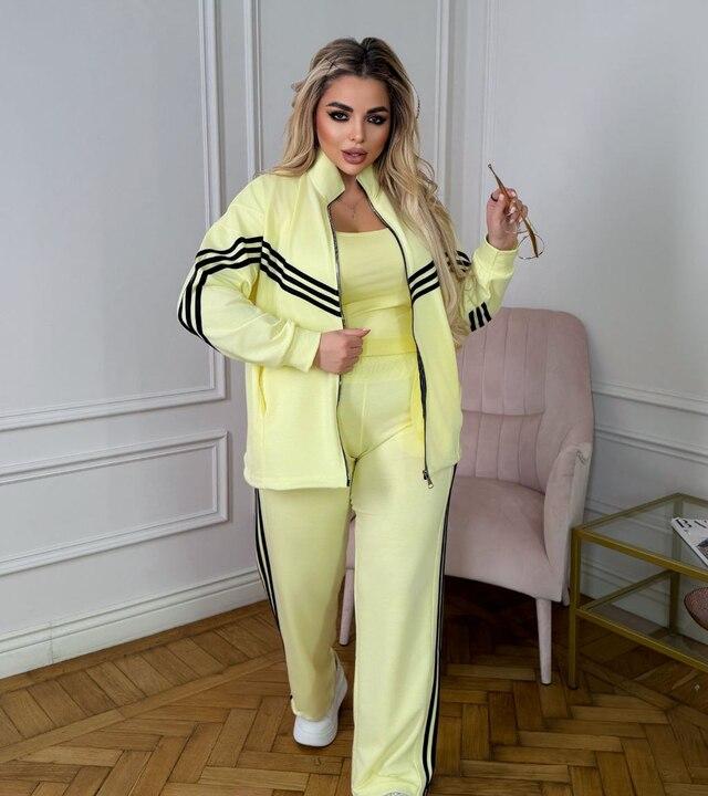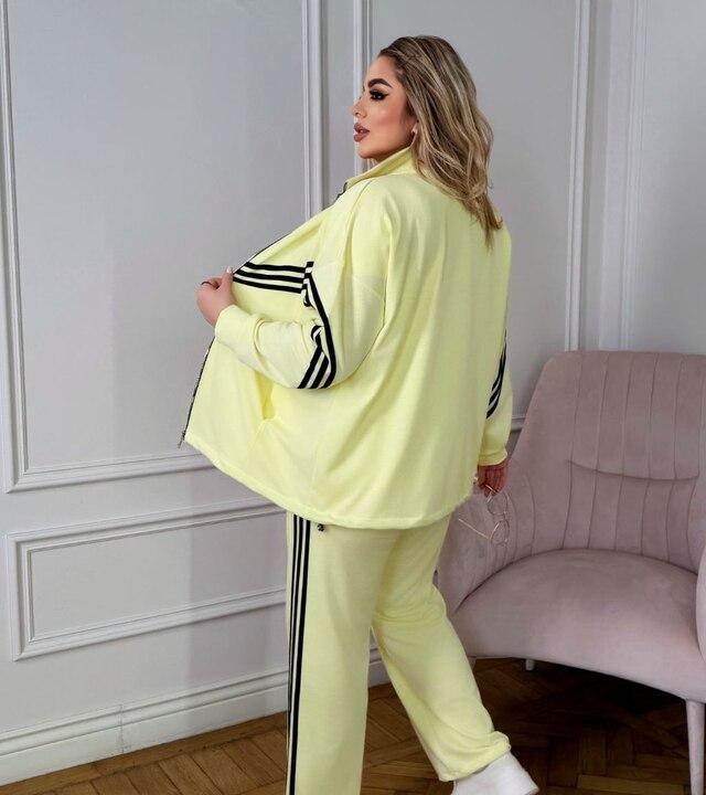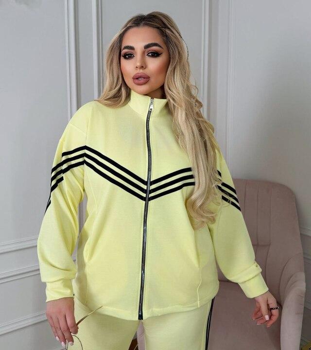 Верх выполнен в формате кофты на молнии, что делает модель особенно удобной. Кофта легко надевается, хорошо сидит и позволяет быстро адаптировать образ под погоду и настроение. По фото видно наличие удобных карманов, а по низу предусмотрена кулиска, благодаря которой можно слегка регулировать посадку и делать силуэт более собранным. Декоративные полосы на груди и по бокам брюк добавляют костюму динамики и делают его визуально более интересным, подчеркивая спортивный характер модели.