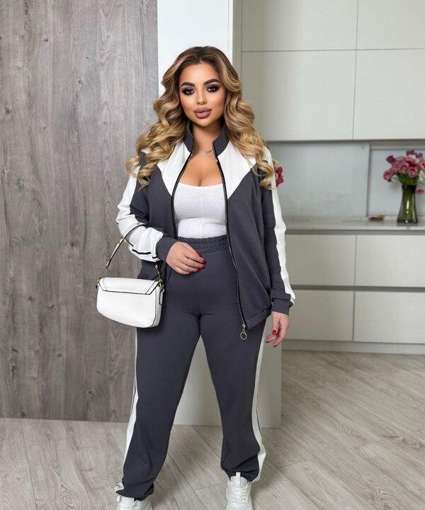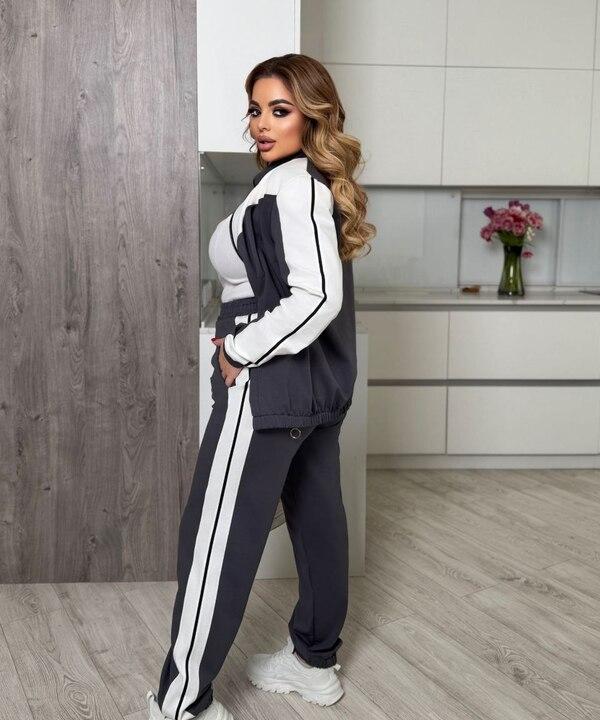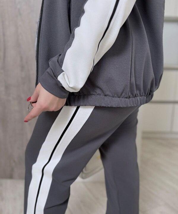 Верх комплекта представлен кофтой на молнии, что делает модель особенно практичной и удобной. Кофту легко надевать и снимать, а также носить как полностью застёгнутой, так и слегка расстёгнутой поверх топа или футболки. Контрастные вставки делают дизайн более выразительным и добавляют костюму спортивный характер. Два кармана делают кофту ещё функциональнее в повседневной носке, а прямой крой обеспечивает свободу движений и комфортную посадку. Такая модель хорошо смотрится не только как часть комплекта, но и отдельно с джинсами, лосинами или другими брюками.