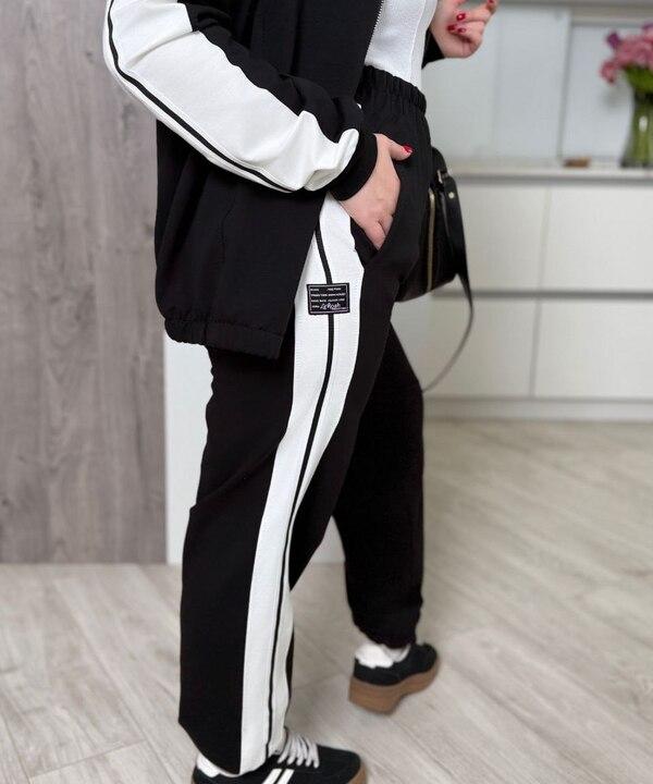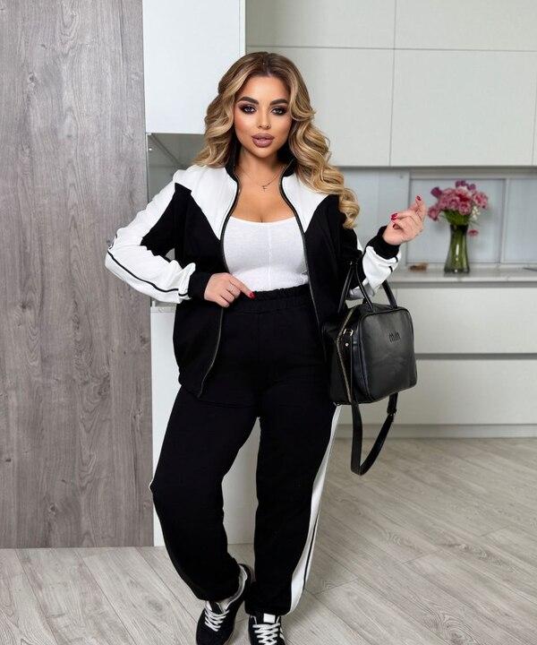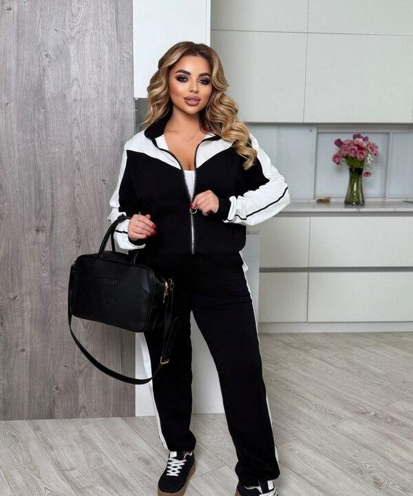 Этот женский спортивный костюм выглядит стильно, современно и очень эффектно за счёт контрастного дизайна, удобного кроя и продуманной посадки. Модель выполнена из турецкой двунитки, поэтому ткань приятна к телу, хорошо держит форму, не выглядит слишком тонкой и отлично подходит для активной повседневной носки в демисезонный период. Такой материал обеспечивает комфорт в течение дня, позволяет свободно двигаться и помогает костюму сохранять аккуратный внешний вид даже при частой носке.