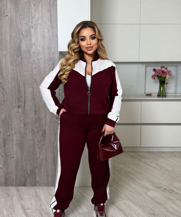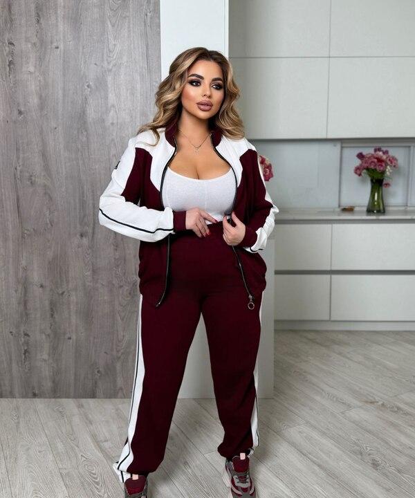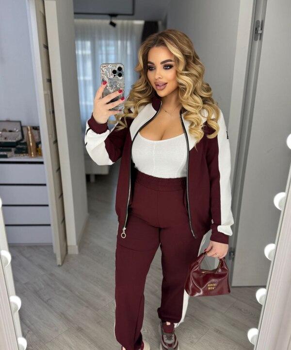 Верх комплекта представлен кофтой на молнии, что делает модель особенно удобной и функциональной. Кофту легко надевать и снимать, а также носить как полностью застёгнутой, так и слегка расстёгнутой поверх топа или футболки. Контрастные вставки и боковые элементы делают дизайн более выразительным, добавляют образу спортивную динамику и визуально придают силуэту более собранный вид. Два кармана делают кофту ещё практичнее в повседневной носке, а прямой крой обеспечивает комфорт и свободу движений. Такая модель хорошо смотрится не только в комплекте, но и отдельно с джинсами, лосинами или другими спортивными брюками.
