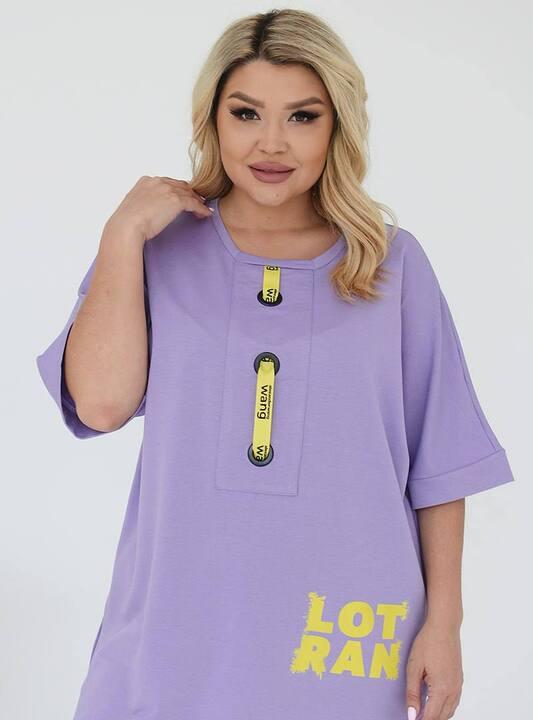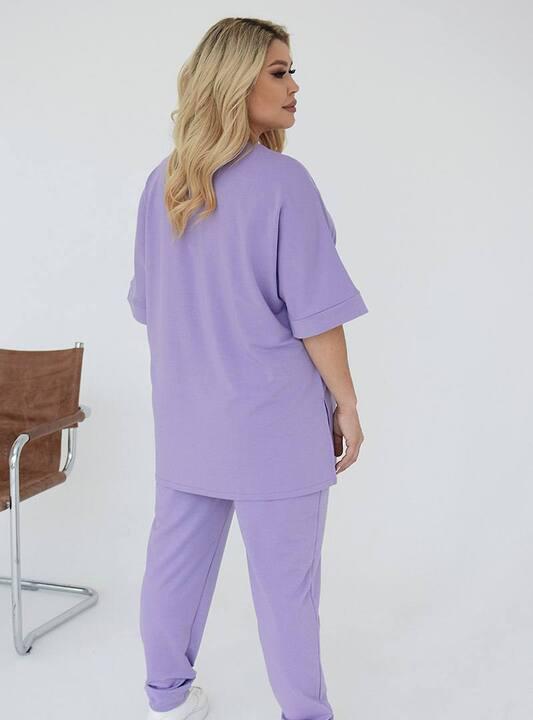 Верх комплекта выполнен в виде свободной удлинённой кофты с коротким рукавом. Такой фасон особенно удобен для весеннего сезона и отлично подходит для прогулок, поездок, повседневных дел и отдыха. Свободный крой не сковывает движения, красиво садится по фигуре и помогает чувствовать себя легко в течение всего дня. Кофта дополнена функциональными карманами, что делает модель ещё практичнее. Спереди расположен декоративный элемент, который добавляет образу выразительность и делает костюм более заметным и стильным. Боковые разрезы в нижней части делают посадку ещё комфортнее и придают модели современный характер.