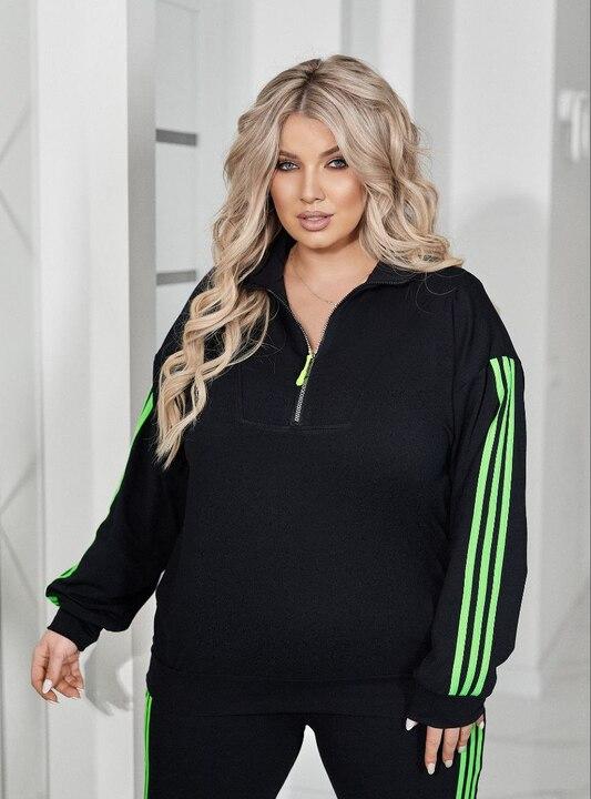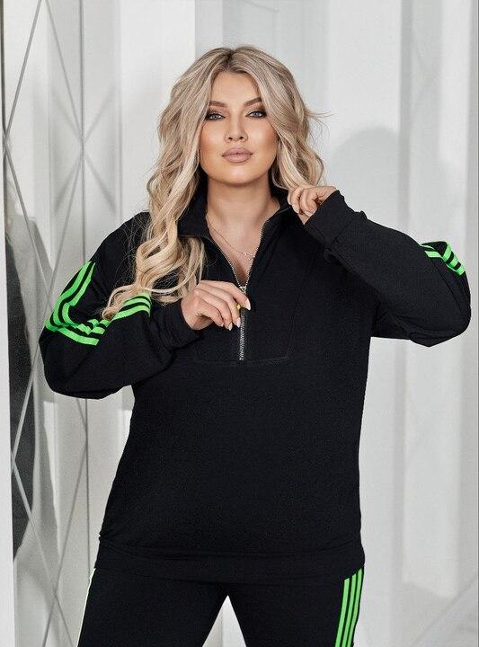 Кофта выполнена в свободном крое, поэтому красиво садится по фигуре, не сковывает движения и дарит комфорт в течение всего дня. Воротник-стойка с молнией делает верх особенно удобным и современным, добавляет образу спортивный характер и позволяет по-разному обыгрывать посадку. Длинные рукава и аккуратные лампасы подчеркивают динамичный стиль модели и делают костюм визуально более выразительным. Верх легко сочетается не только с комплектными брюками, но и с джинсами, леггинсами или другой повседневной одеждой.