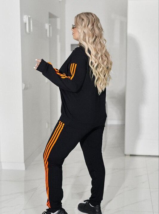 Брюки в этом костюме смотрятся практично и современно. Они заужены к низу, дополнены манжетами и хорошо сидят, благодаря чему образ выглядит аккуратным и гармоничным. Пояс на резинке обеспечивает удобную посадку и комфорт в носке, а лампасы по бокам поддерживают общий стиль комплекта и делают силуэт более собранным. Такой фасон отлично подходит для ежедневной носки, потому что в нем удобно двигаться, отдыхать, гулять и заниматься привычными делами.