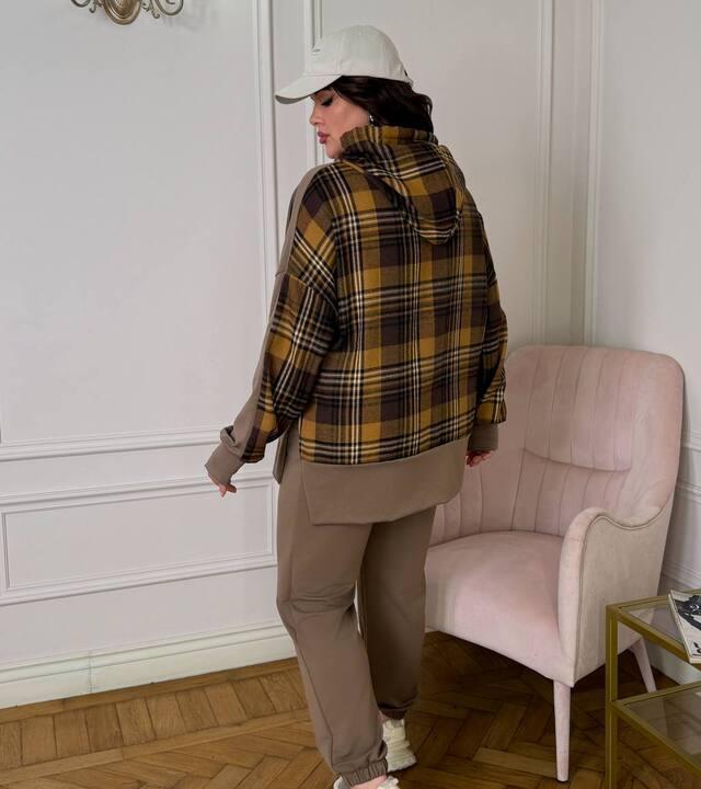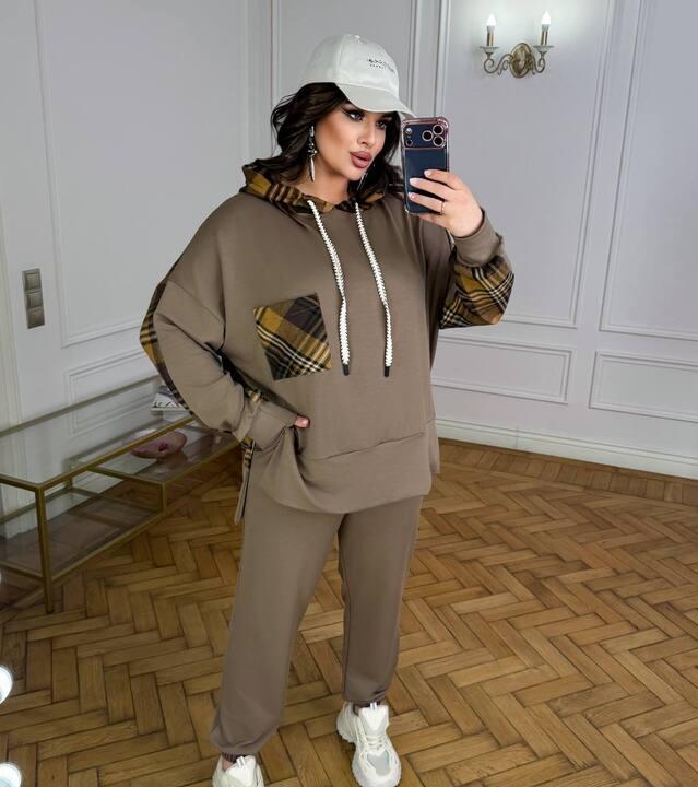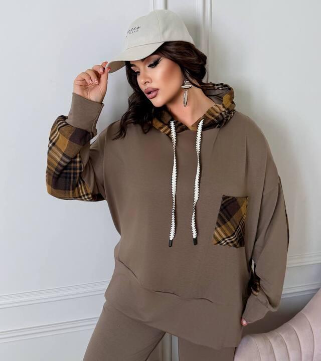 Верх выполнен в свободном крое, поэтому красиво садится по фигуре, не сковывает движения и дарит ощущение легкости в течение всего дня. Худи с капюшоном делает образ более расслабленным и современным, а длинные шнурки у горловины подчеркивают спортивный характер модели. Особое внимание сразу привлекают контрастные клетчатые вставки на рукавах и кармане. Именно они делают костюм более выразительным, добавляют ему оригинальности и создают эффект интересного дизайнерского решения. За счет таких деталей комплект выглядит модно, свежо и заметно выделяется среди обычных базовых спортивных костюмов.