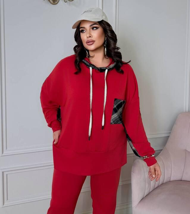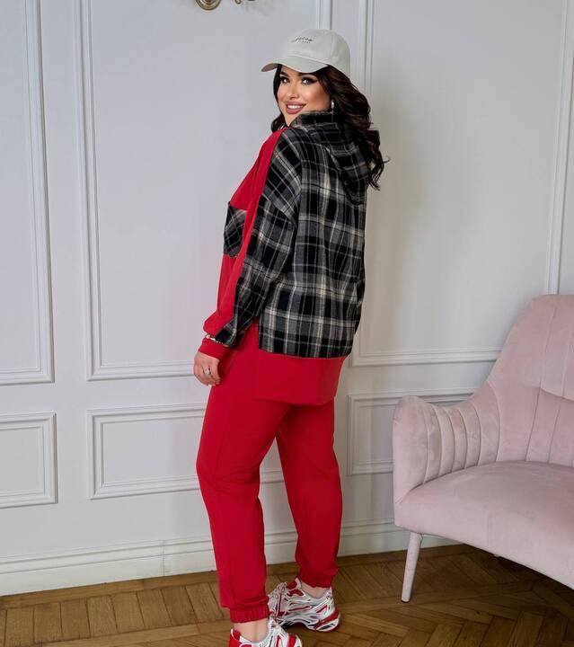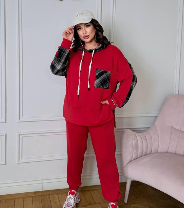 Верх выполнен в свободном крое, поэтому красиво садится по фигуре, не сковывает движения и дарит ощущение легкости в течение всего дня. Худи с капюшоном делает образ более расслабленным и современным, а длинные шнурки у горловины подчеркивают спортивный характер модели. Особое внимание сразу привлекают контрастные клетчатые вставки на рукавах и кармане. Именно они делают костюм более выразительным, добавляют ему оригинальности и создают эффект интересного дизайнерского решения. За счет таких деталей комплект выглядит модно, свежо и заметно выделяется среди обычных базовых спортивных костюмов.