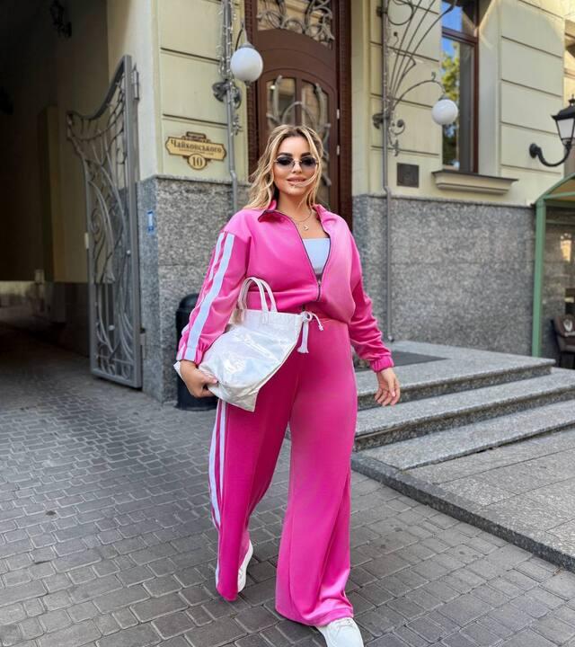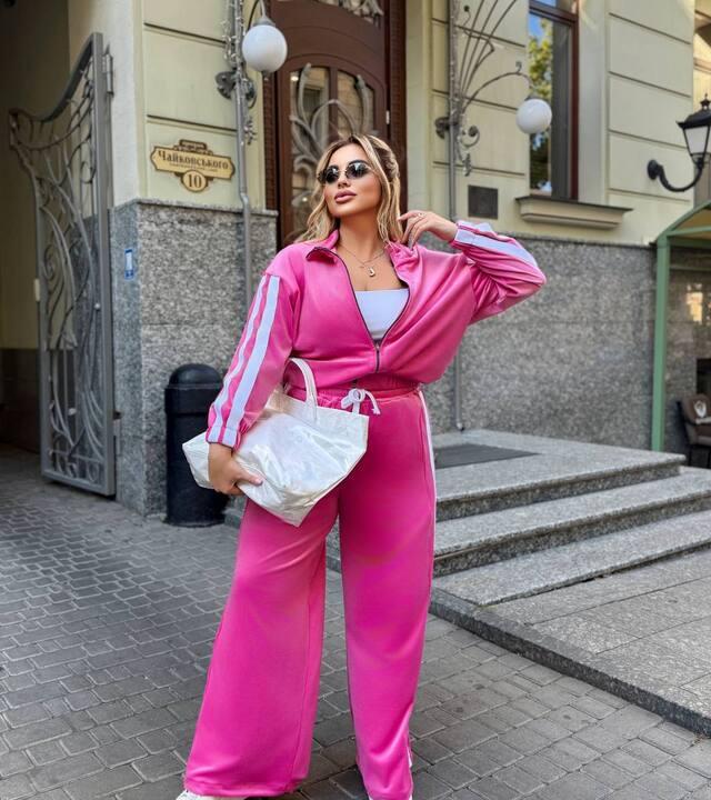 Верхняя часть комплекта смотрится стильно и спортивно, придавая образу более собранный характер. Декоративные контрастные полосы на рукавах добавляют динамику и делают костюм заметнее. Благодаря таким деталям модель выглядит более выразительно и современно, а сам образ приобретает модное спортивное настроение. Комплект отлично подходит для тех, кто любит комфортную одежду с эффектной подачей и хочет выделяться без лишних усилий.