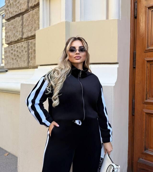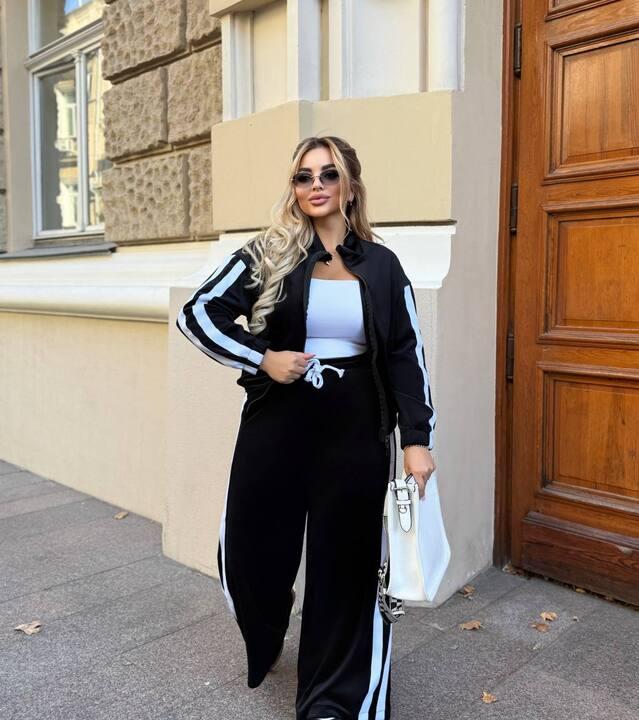 Верхняя часть комплекта смотрится стильно и спортивно, придавая образу более собранный характер. Декоративные контрастные полосы на рукавах добавляют динамику и делают костюм заметнее. Благодаря таким деталям модель выглядит более выразительно и современно, а сам образ приобретает модное спортивное настроение. Комплект отлично подходит для тех, кто любит комфортную одежду с эффектной подачей и хочет выделяться без лишних усилий.