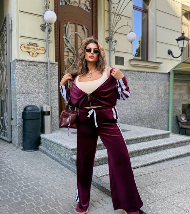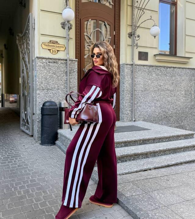 Верхняя часть комплекта смотрится стильно и спортивно, придавая образу более собранный характер. Декоративные контрастные полосы на рукавах добавляют динамику и делают костюм заметнее. Благодаря таким деталям модель выглядит более выразительно и современно, а сам образ приобретает модное спортивное настроение. Комплект отлично подходит для тех, кто любит комфортную одежду с эффектной подачей и хочет выделяться без лишних усилий.