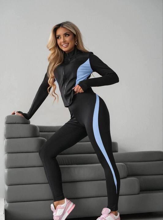 Леггинсы гармонично дополняют верх и формируют цельный спортивный образ. Они хорошо садятся по фигуре, не сковывают движения и подчеркивают силуэт, делая его более собранным и подтянутым. Контрастные боковые вставки играют важную роль в общем впечатлении от модели: они визуально вытягивают силуэт, делают линии фигуры более выразительными и добавляют образу яркий современный акцент. Благодаря такому решению костюм смотрится не просто базово, а действительно стильно и заметно.